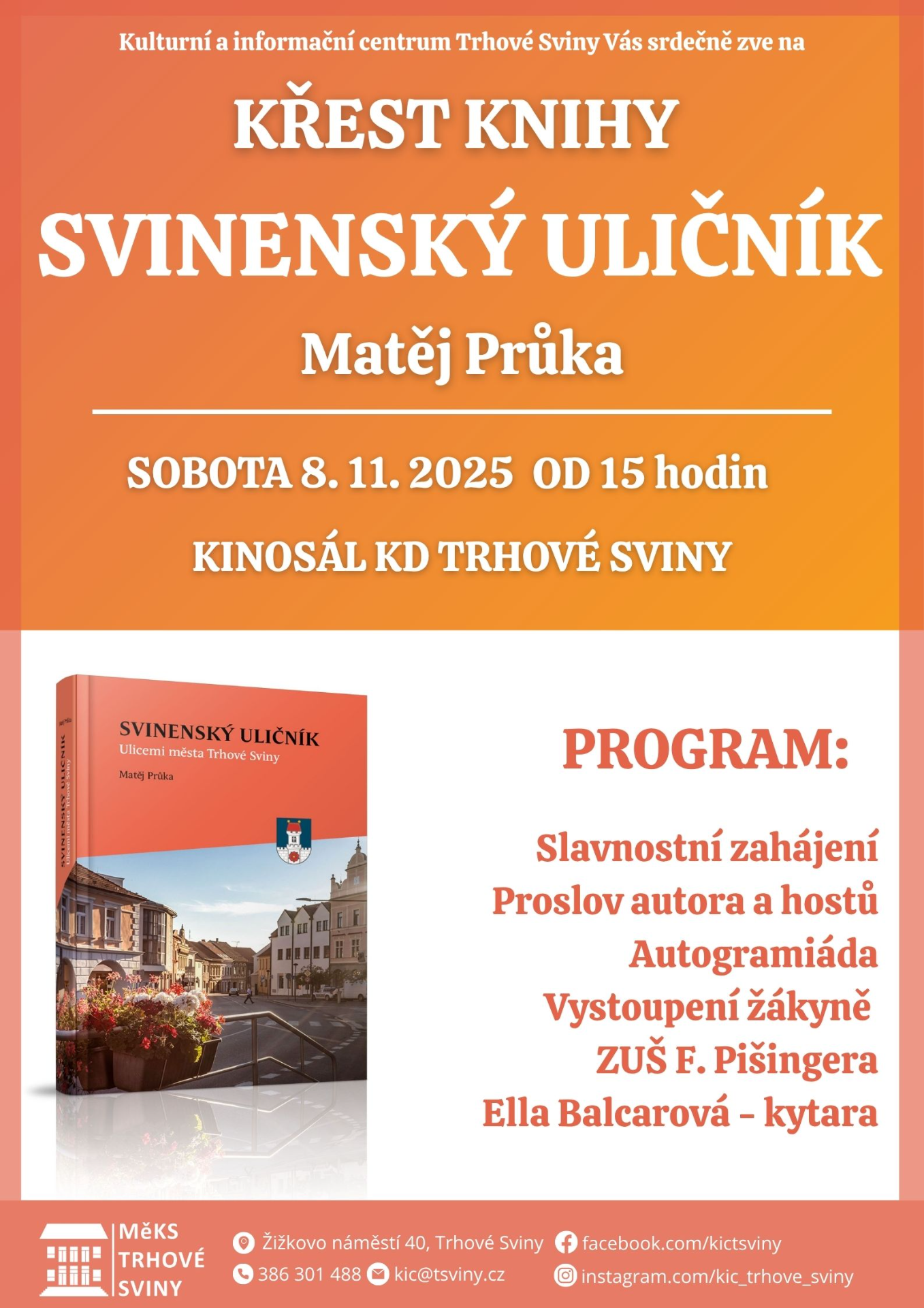 Křest knihy mladého autora - svinenského kronikáře Matěje Průky, který nám na jejích stránkách odtajní, jak se měnily a vyvíjeli názvy ulic v Trhových Svinech a nejen to.